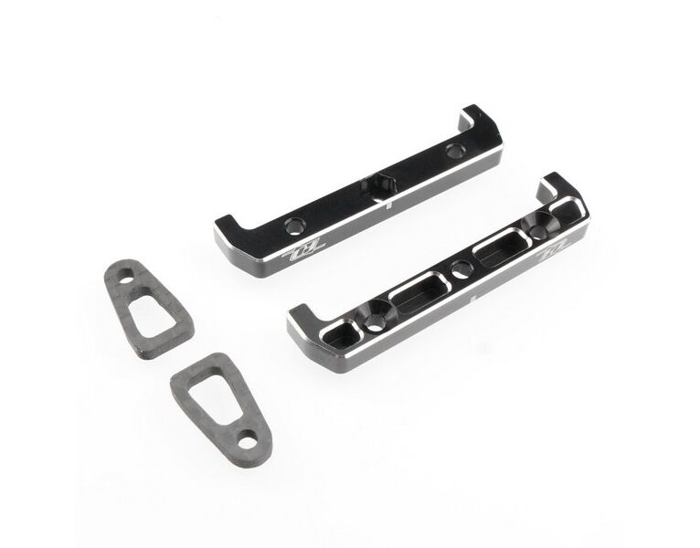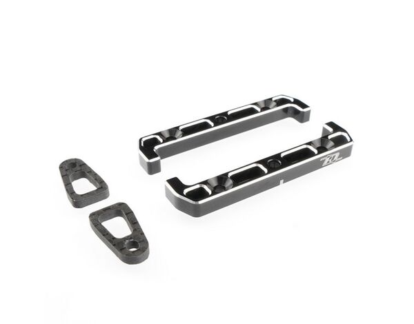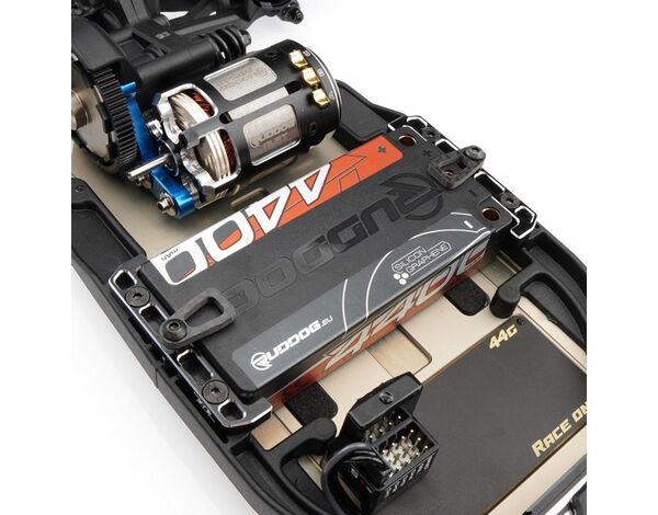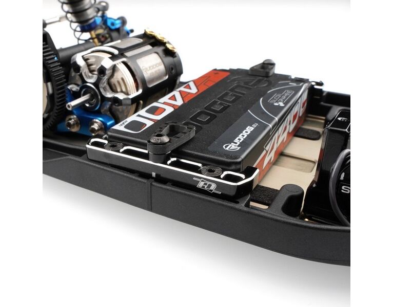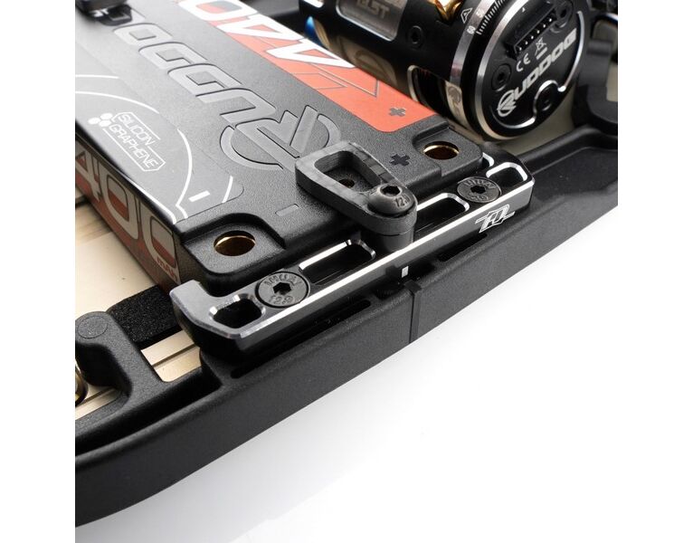 Das Revolution Design Racing Products (RDRP) B7 Ultra Battery Mount Set (RDRP0648) ist ein direkter Ersatz für die standardmäßige Kunststoff-Akkuhalterung. Das Aluminium Battery Mount Set sieht nicht nur großartig aus mit seinem schwarz eloxierten Aluminium und den silbernen abgeschrägten Kanten, es ist auch eine stabilere Version und hält Ihren Akku sicher an seinem Platz. Zusätzlich verleiht die Kombination aus Aluminium- und Carbonfaserteilen Ihrem Team Associated RC10B7 und RC10B7D Buggy ein professionelles Aussehen und ist für Shorty-Akkus aller Kapazitäten und Größen geeignet. Das Set beinhaltet drei verschiedene Höhen von Unterlegscheiben und Schraubenlängen, um die Halterung an die Akkuhöhe anzupassen und kann ohne Werkzeuge bedient werden.