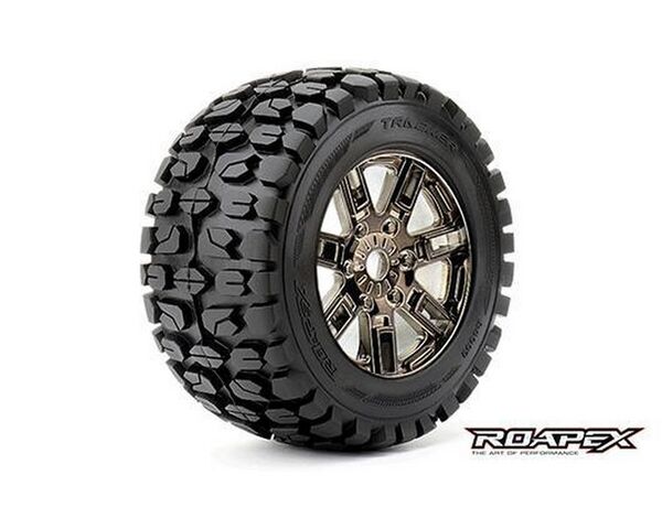 RXR4003-CB0 Reifen 1/8 Monster Truck montiert 0 offset Chrome Schwarz Felgen 17mm Hex Tracker (2 Stk.)