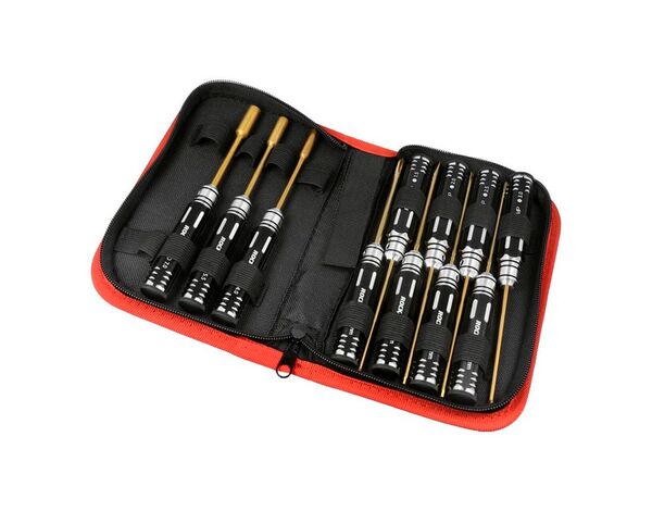 Das besondere Rockamp-Etui sorgt dafür, dass dieses 11-teilige Set den Inhalt stets zusammenhält und gut verstaut werden kann. Enthalten sind hier vor allem hochwertige Schraubendreher mit HSS-Titan-Beschichtung, die im alltäglichen RC-Leben nicht fehlen sollten. Als Abrundung liegen auch Steckschlüssel-Schraubendreher bei und es bleibt trotzdem noch Platz für eigene Werkzeuge.