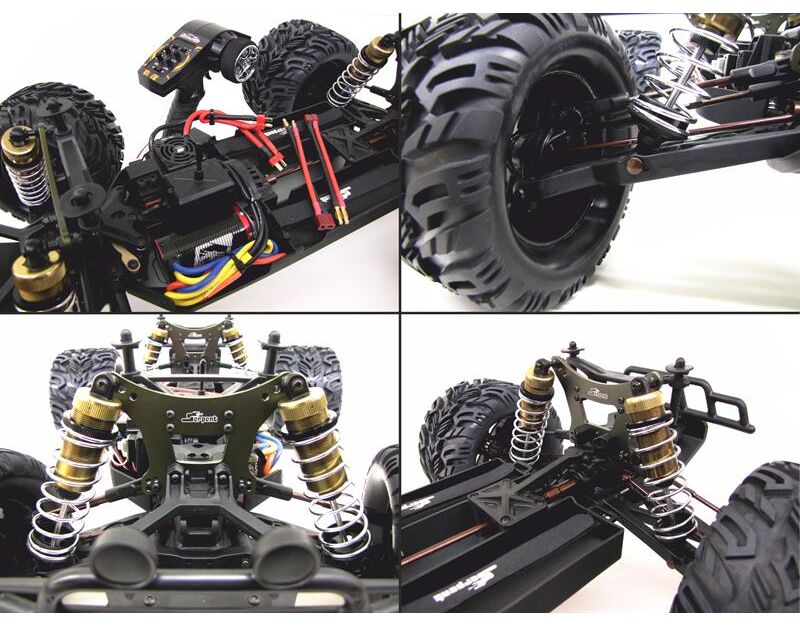 Very narrow 3mm 7075T6 aluminium chassis, with machining on the upper face to make it lighter in strategic locations and to control flex. Kick-up front for proper landings. Angled side to increase cornering clearance, and secure and easy mounting side guards with 5 screws. Countersunk holes. Overall the Monster Truck is designed to keep the weight very central and near to the centerline as possible, to create a great overall balance.