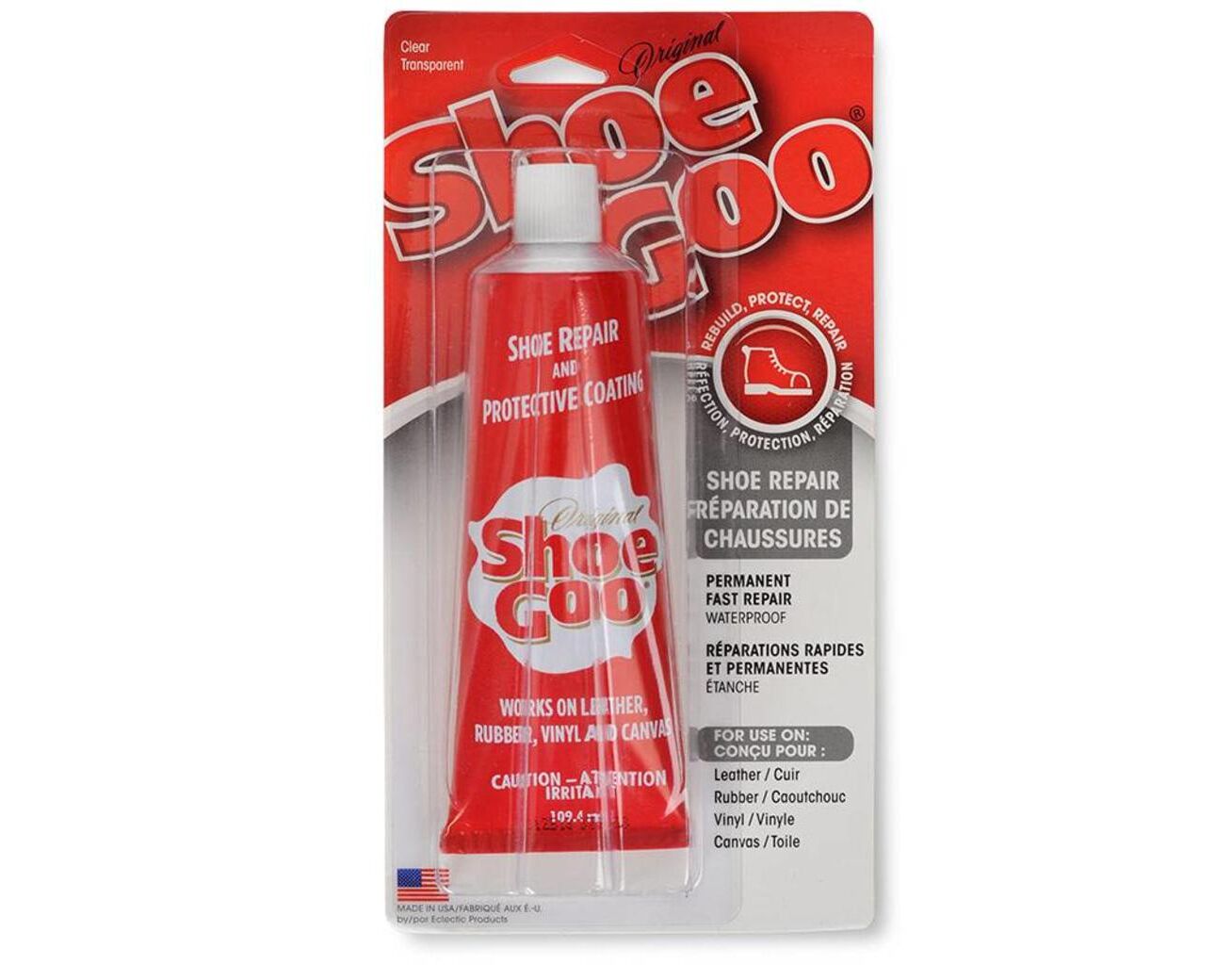 SHOE GOO Schuhkleber wurde speziell zum reparieren von Schuhen hergestellt. Die Abriebbeständigkeit und die Dickflüssigkeit verlängert das Leben jedes Schuhes. Wenn ein getragener Schuh in der Laufsohle ein durchgehendes Loch hat, sollte die Stelle im Schuhinnern mit einem Klebeband abgeklebt werden bevor SHOE GOO zum Einsatz kommt. Es verhindert die Bildung einer Beule. Das Klebeband muss innerhalb von zwei Stunden abgenommen werden und überflüssiges Material sollte glatt gestrichen werden bevor der Kleber völlig eingetrocknet ist.