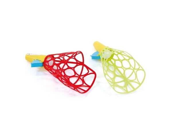 Durch die Abschussvorrichtung am Griff wird der Ball aus dem Fangkorb geschleudert, den der andere Mitspieler mit seinem Fangkorb wieder auffangen muss