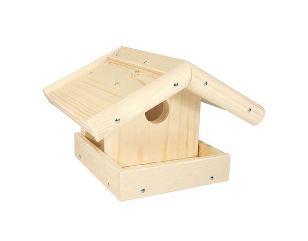 Ein Vogelhaus mit kleiner Terrasse zum zusammenbauen als Bastelsatz, hochwertig verarbeitet und aus unbehandelten Massivholz hergestellt.