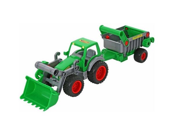 Der Traktor mit Frontlader und Kipper überzeugt durch die abgerundeten Kanten und die Luftgummibereifung auf einer Stahlachse sowie dem großen und griffigem Trage/Schiebegriff