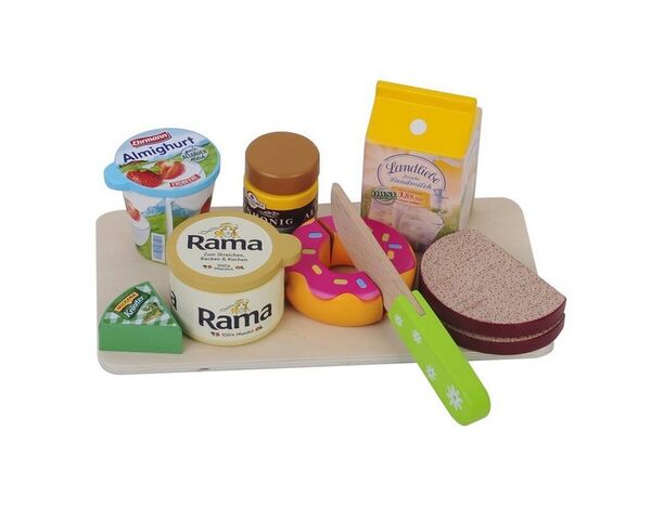 Das reichhaltige Frühstücks-Set aus Holz beinhaltet eine Rama Butter, Breitsamer Honig, Ehrmann Joghurt, Landliebe Milch, Milkana Käse, 2 Scheiben Brot, ein Donut, Schneidebrett und ein Messer zum Schneiden. Die Deckel, der Donut sowie die Brotscheiben sind mit einem Klettverschluss versehen und können spielerisch und kinderleicht abgenommen werden. Alle Artikel sind scannbar.