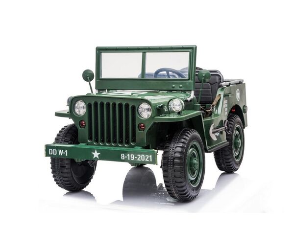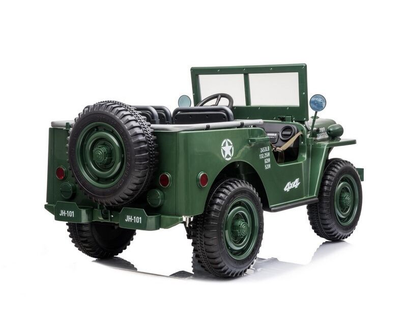 SIVA TOYS US Military Truck 4WD 2.4 GHz 3 seater Highlights: US-Militärfahrzeug - ferngesteuert oder selbstfahren 3 Sitzer Sound Stoßstange vorne aus Metall 4WD Allradantrieb Geschwindigkeit ca. 3-7 km/h Geschwindigkeit proportional regelbar Flüsterreifen Startknopf Außenspiegel Kunstledersitze 12V 10ah Akku Tragegriff hinten zum Transportieren Hupe inkl. Spaten Kofferraum vorne Verstaufächer hinten inkl. 2.4 GHz Fernsteuerung LED-Scheinwerfer vorne – ein- und ausschaltbar MP3, USB, SD Sicherheitsgurt an allen Sitzen 2 Geschwindigkeitsstufen mit Softanlauf mit Gangschaltung - Vorwärts- und Rückwärtsgang geeignet für Kinder von 3-6 Jahren Tragkraft bis 60 kg gefederte Radaufhängung 4 x 45W Motoren vollwertiges Ersatzrad klappbare Frontscheibe hintere Federung einstellbar vorwärts - rückwärts - links - rechts Indoor/Outdoor Lieferumfang: US Military Jeep Fernsteuerung 2.4 GHz Akku 12V 10ah Ladegerät Spaten Anleitung Technische Daten: Maße: ~158x80x82 cm Gewicht: ~37