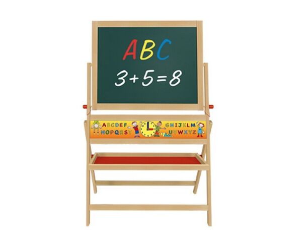 Große Stand und Wendetafel aus Buchenholz die mit Kreide und Magnet nutzbar ist. Mit praktischer Ablage und einer ABC Aufzählung mit Spiel/Lern Uhr.