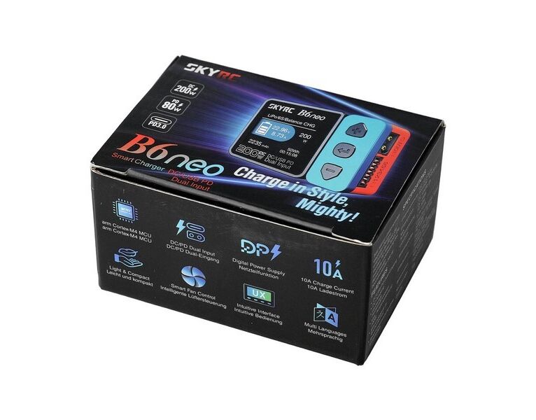 Der B6neo von SkyRC bringt mit dem auffälligen zweifarbigen Design und den spielerischen Farboptionen Spaß beim Laden. Egal ob auf der Rennstrecke oder im Hobbybereich, es hebt sich einfach mit dem lebendigen Farbschemata von der Masse ab und zeigt die einzigartige Persönlichkeit des Besitzers. Das B6neo mag kleiner als eine Kreditkarte sein und damit locker in eine Hand passen, es ist aber trotzdem äußerst leistungsstark und deswegen nicht zu unterschätzen. Mit einer Ladekapazität von bis zu 200W (DC) und bis zu 80W mit USB PD-Eingang setzt es vollkommen neue Maßstäbe für vergleichbare RC-Ladegeräte. Das elegante Kunststoffgehäuse mit seinen attraktiven Farben ist ein echter Hingucker!