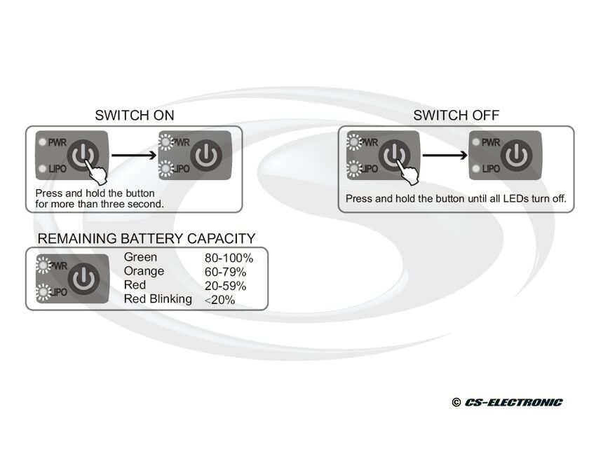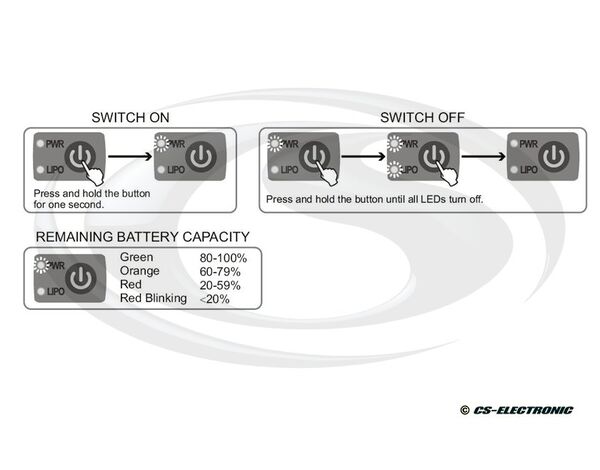 Zum Einschalten drücken und halten Sie den Schalter für mehr als drei (3) Sekunde. Die Power "PWR" LED und LIPO LED leuchten nun. Zum Ausschalten drücken und halten Sie den Schalter bis alle LED's erloschen sind. Die Power "PWR" LED signalisiert Ihnen beim Einschalten die verbleibende Kapazität des Akkus.