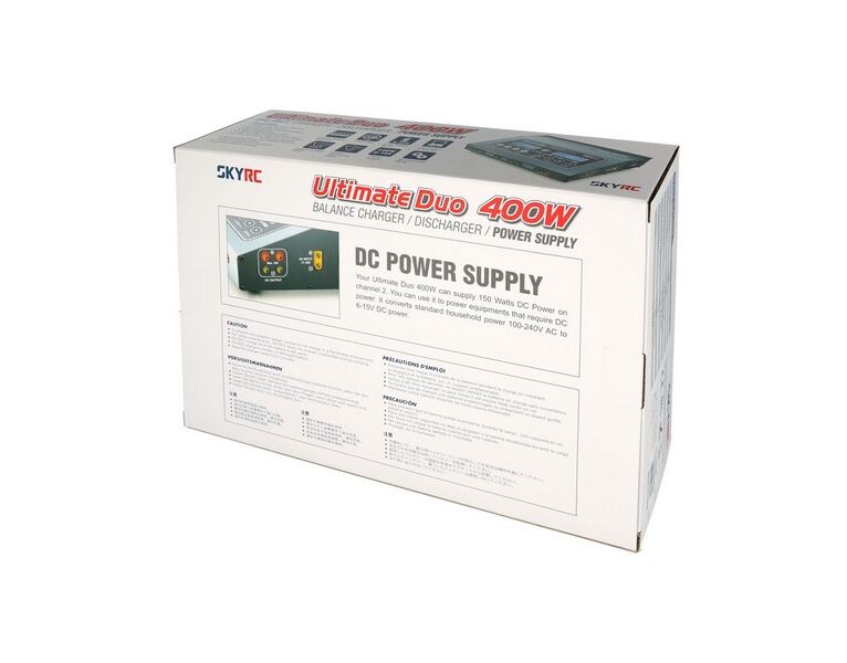 Das Ultimate Duo 400W bietet zusätzlich ein 150 Watt DC Power Netzteil an Kanal 2, dass 100-240V AC in 6-15V DC umwandelt.