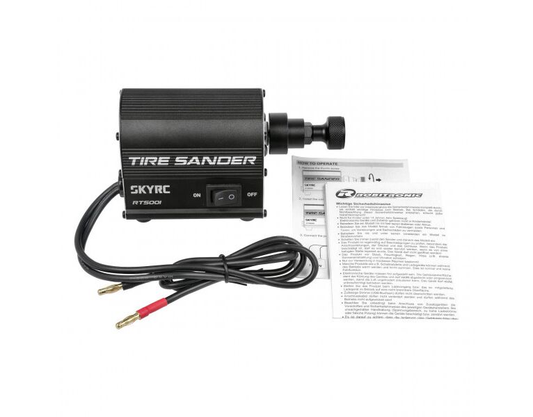 Die Reifenschleifmaschine von SkyRC ist mit einem hochpräzisen Adapter ausgestattet. Das handliche Design ermöglicht noch dazu ein einfaches Schleifen der Reifen egal an nahezu jedem Ort, solange zum Beispiel eine 12V-Stromversorgung zur Verfügung steht oder ein 2S-LiPo-Akku griffbereit ist.