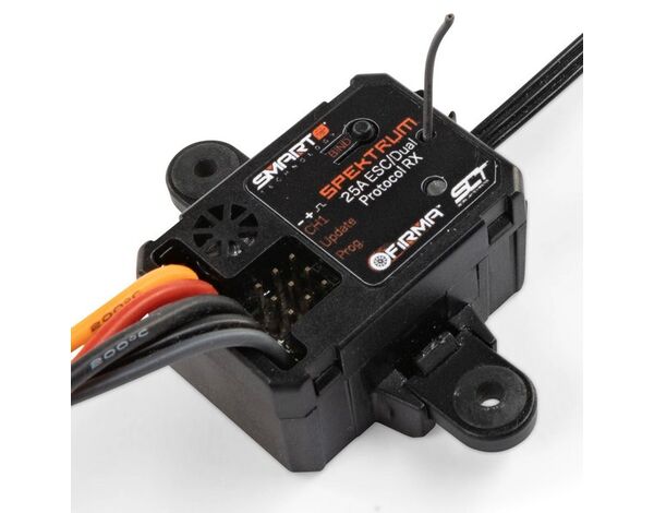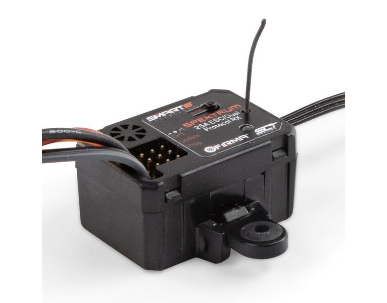 Diese Kombination aus ESC und Empfänger ist mit Spektrum DSM2®/DSMR®/SLT-Surface-Fernsteuerungen kompatibel und verfügt über eine integrierte Smart-Telemetrie. Verwende einen Spektrum-Sender mit Smart-kompatibler Telemetrie, um ESC- und Akkudaten anzeigen zu lassen.