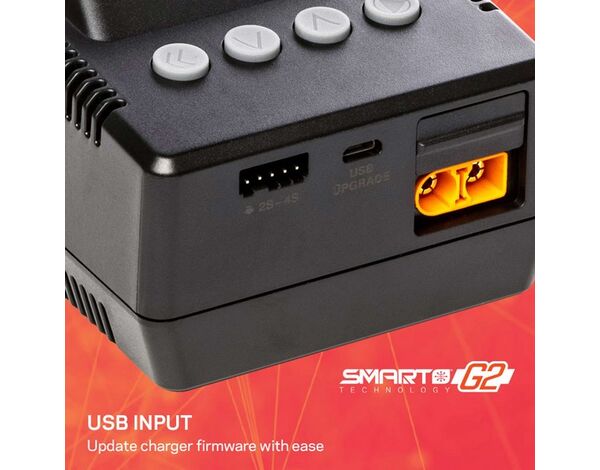 Beim S155 Smart G2 AC Ladegerät kannst du zwischen einem IC3® oder IC5® Ausgangsanschluss zum Aufladen deiner Smart Akkus wählen und benötigst keine zusätzlichen Adapter. Du kannst Smart G2-Akkus mit einer einfachen Steckverbindung aufladen und balancen – es ist kein separates Balancer-Kabel erforderlich. Ein USB-Anschluss ist ebenfalls vorhanden, damit du die Firmware des Ladegeräts einfach auf dem neuesten Stand halten kannst.