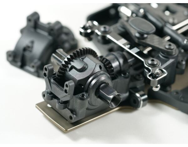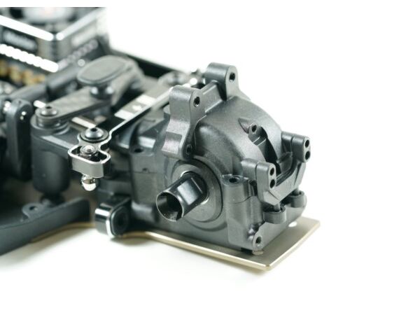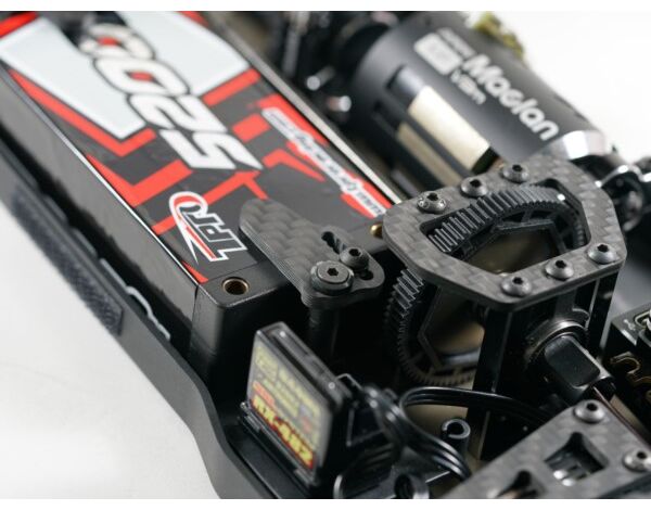 Der S14-4C verfügt über das neue Getriebe mit einstellbarem Diff. System auf einem hart eloxierten und leichteren T7075-Aluminiumchassis. Der Flex des Chassis kann durch unterschiedliche Material-Sideguards verändert werden.