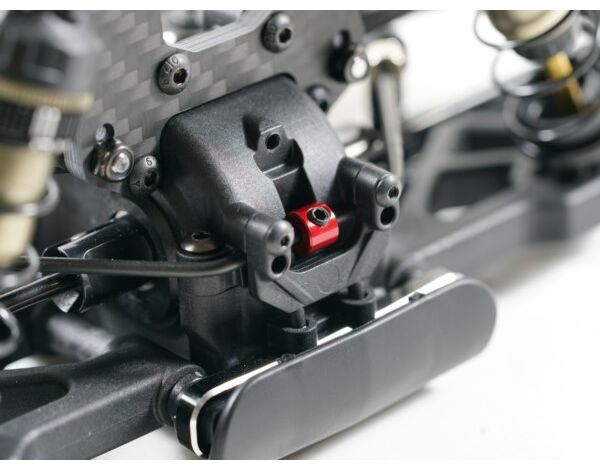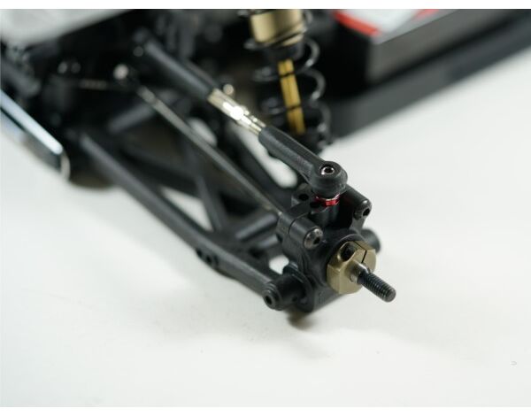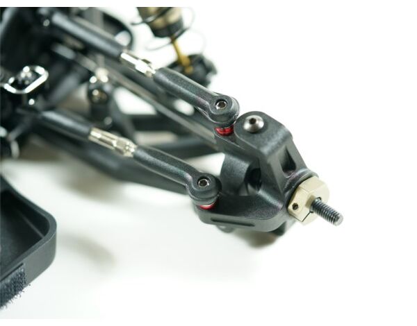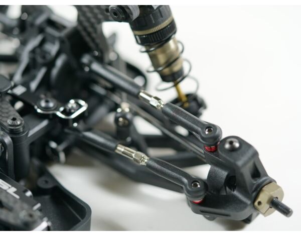 Ein brandneues 5,5-mm-Gelenkkugelbolzensystem und 3,5-mm-langlebige Spannschlösser sind im S14-4C-Kit enthalten. Brandneue verstellbare Ackermannplatte mit erleichtertem Lenkwinkelsystem sind ebenfalls enthalten. Der S14-4C hat neue hintere abgewinkelte untere Querlenker, die eine niedrigere Stoßdämpferposition bieten, was zu einem niedrigeren Schwerpunkt führt. Die Querlenker des S14-4C sind aus hochwertigem Pro Composite Carbon-Material gefertigt.