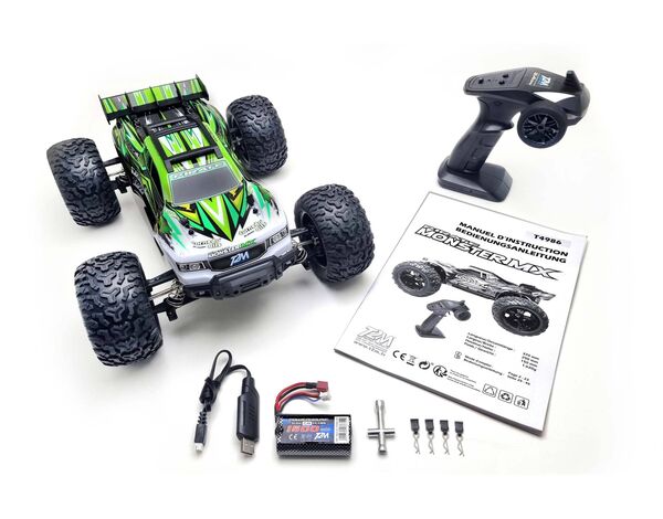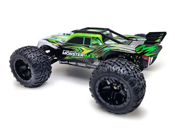Dieser fahrbereite 1:10 Elektro-Geländebuggy mit Allradantrieb zeichnet sich durch seine zahlreichen hochwertigen Ausstattungsmerkmale aus, die für optimale Zuverlässigkeit und Leistung sorgen. Sein robustes Chassis, sein leistungsstarker Motor vom Typ 550, sein vollständig kugelgelagertes Getriebe mitdrei Zahnraddifferenzialen und zentralem Kardanwellenantrieb aus behandeltem Stahl, seine Federung mit hydraulischen Stoßdämpfern und seine überdimensionalen Reifen ermöglichen es ihm, Geländehindernisse mit hoher Geschwindigkeit zu überwinden. Dank des wasserdichten Funkempfängers und Reglers ist der Pirate Monster MX gegen Spritzwasser und Schnee geschützt. Die Karosserie aus Polycarbonat, eine Nachbildung eines Rallye-Raid-Buggys, ist lackiert und verziert. Die Steuerung ist dank eines ergonomischen 2,4-GHz-Senders mit Lenkrad/Auslöser sowohl reaktionsschnell als auch präzise. Der Pirate Monster MX ist attraktiv, schnell, robust, gut geschützt und hervorragend ausgestattet und somit das ideale Modell, um in die spannende Welt der ferngesteuerten Autos einzusteigen!