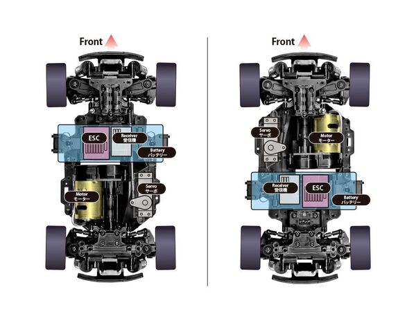 The compact, 2WD MB-01 chassis gives a choice of three types of wheelbases, and front- or rear- wheel drive system. This model employs a midship motor, rear-wheel drive setup. Without removing battery pack, motor, and R/C equipment setups from the center frame, simply change attachment directions of final gears and steering linkage to switch between front- and rear-wheel drive; low or high motor position can be chosen for rear-wheel drive cars. The 4-wheel double wishbone suspension features symmetrical structure and friction dampers. Unitized sections such as motor mount, final gears and suspension facilitate ease of assembly and effective maintenance.