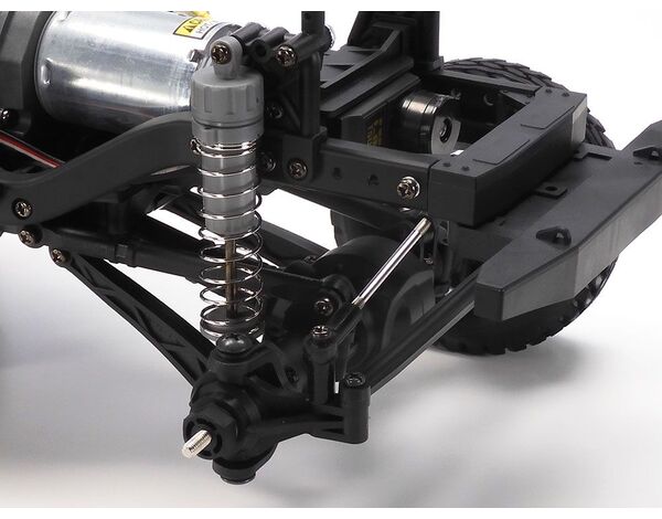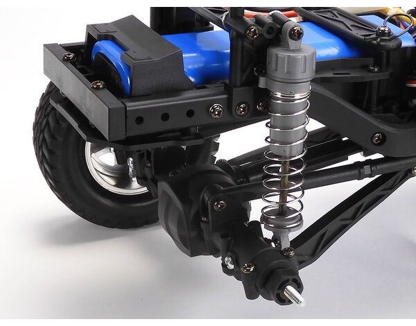 Designed for a wide range of off-road scenes including rocky terrain, the CC-02 chassis' ladder frame is inspired by full-size vehicles and is the base for its superior durability. A 4WD setup employs the motor longitudinally behind the front axle with separated gearbox and transfer case, and propeller shafts transmitting power to the differential gears front and rear. Four-link rigid suspension is employed front and rear, with CVA oil dampers for all-encompassing control, even on tricky rock sections. This model comes with spoke wheels and semi-pneumatic rubber tires.