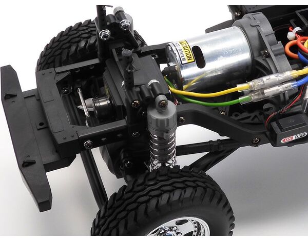 Designed for a wide range of off-road scenes including rocky terrain, the CC-02 chassis' ladder frame is inspired by full-size vehicles and is the base for its superior durability. A 4WD setup employs the motor longitudinally behind the front axle with separated gearbox and transfer case, and propeller shafts transmitting power to the differential gears front and rear. Four-link rigid suspension is employed front and rear, with CVA oil dampers for all-encompassing control, even on tricky rock sections. This model comes with spoke wheels and semi-pneumatic rubber tires.