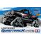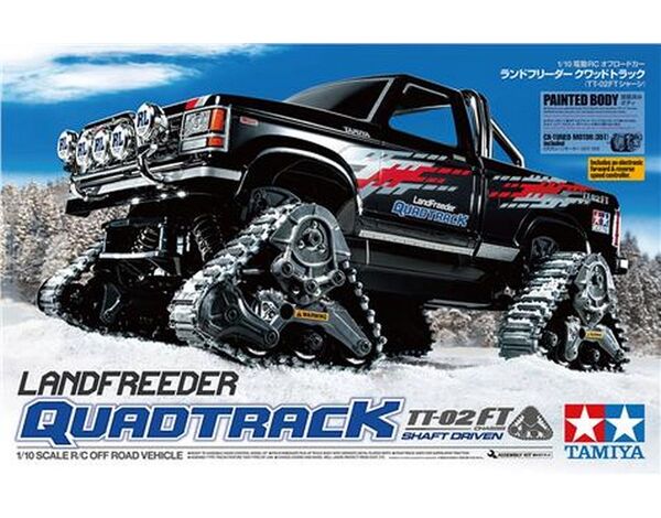 Der Quadtrack ist das erste 1:10 Modell von TAMIYA, welches über einen Kettenantrieb verfügt. Bekannt ist diese Antriebsart von Arktis Expeditionsfahrzeugen. Jetzt kombiniert TAMIYA diesen Antrieb mit dem beliebten Landfreeder. Dafür wurde das robuste TT-02 Chassis umgebaut. Anstatt den Rädern besitzt er nun Kettenantriebe. Die Ketten haben eine viel größere Aufstandsfläche als Räder und haben somit mehr Traktion. Das Modell hat weiterhin eine Polycarbonat Chassisabdeckung und Radkästen, um es vor Verschmutzungen zu schützen.