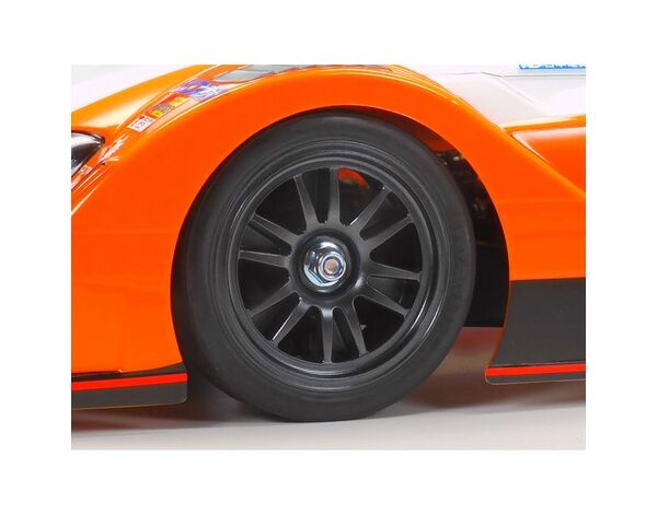 Das wellengetriebene Allrad-Chassis des TT-02 ist in Längsrichtung angeordnet, wobei sich die Batterie auf der linken und der Motor auf der rechten Seite befindet, um eine hervorragende Stabilität zu gewährleisten. Darüber hinaus verfügt es über identische linke und rechte Aufhängungsarme und Achsschenkel, was die Montage erleichtert, sowie über leicht zu wartende Getriebe. Es ist ein äußerst anpassungsfähiges Fahrgestell, denn es bietet 2 verschiedene Radstände, 2 Bodenfreiheitsstufen und 2 Profilabstimmungen sowie eine Reihe von 10 möglichen Getriebeübersetzungen. Auch die Optik kommt nicht zu kurz, mit Radnaben in Form von Bremsscheiben und stilvollen vorderen Stoßfängerträgern. Die 10-Speichen-Räder in Gun-Metal-Farbe und die Slick-Reifen sorgen für ein rasantes Finish.