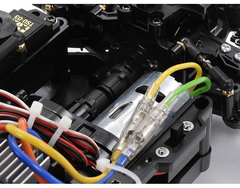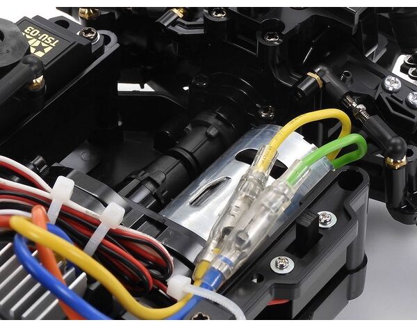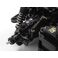 • Without removing battery pack, motor, and R/C equipment setups from the center frame, simply change attachment directions of final gears and steering linkage to switch between front- and rear-wheel drive; front (FR) or midship rear (MR) motor position can be chosen for rear-wheel drive cars. (Six setups are available in total.)