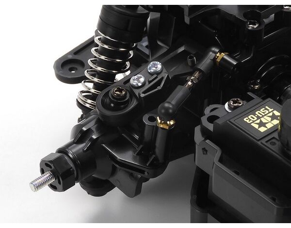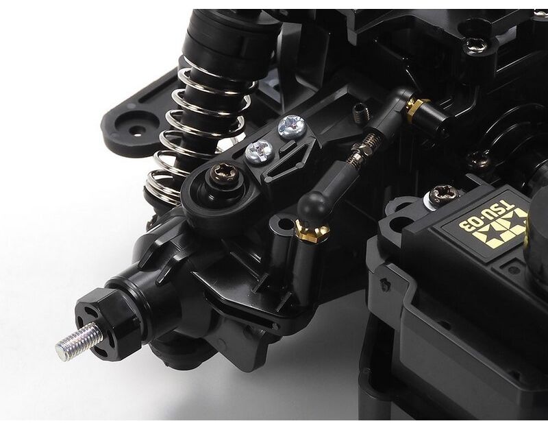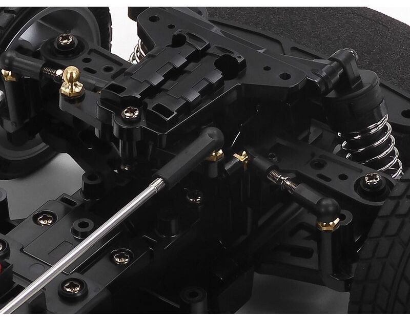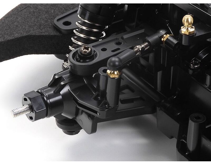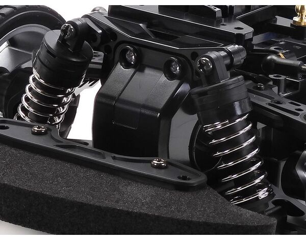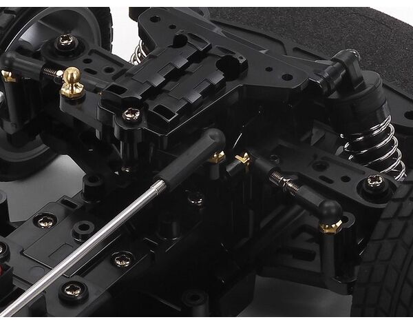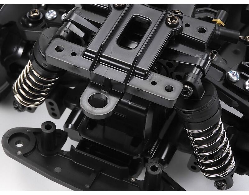 The 2WD BT-01 chassis gives the choice of two types of wheelbases, and front-or rear-wheel drive system. Without removing the battery pack, motor, and R/C equipment setups from the center frame, simply change attachment directions of final gears and steering linkage to switch between front-and rear-wheel drive; front (FR) or midship rear (MR) motor position can be chosen for rear-wheel drive cars. The 4-wheel double wishbone suspension features symmetrical structure and friction dampers. Unitized sections such as the motor mount, final gears and suspension facilitate ese of assembly and effective maintenance.