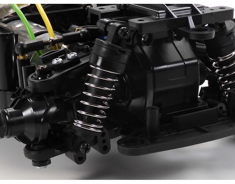 The 2WD BT-01 chassis gives the choice of two types of wheelbases, and front-or rear-wheel drive system. Without removing the battery pack, motor, and R/C equipment setups from the center frame, simply change attachment directions of final gears and steering linkage to switch between front-and rear-wheel drive; front (FR) or midship rear (MR) motor position can be chosen for rear-wheel drive cars. The 4-wheel double wishbone suspension features symmetrical structure and friction dampers. Unitized sections such as the motor mount, final gears and suspension facilitate ese of assembly and effective maintenance.