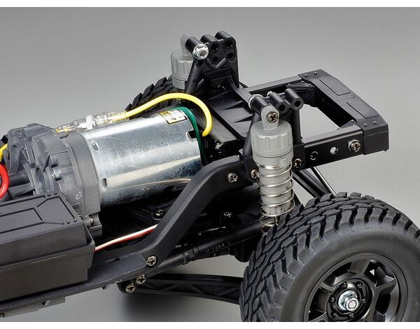 Das CC-02 Chassis wurde für eine Vielzahl von Off-Road-Szenarien, einschließlich felsigem Gelände, entwickelt. Der Leiterrahmen des CC-02 Chassis wurde von großen Fahrzeugen inspiriert und ist die Basis für seine überlegene Robustheit. Der Motor befindet sich in Längsrichtung hinter der Vorderachse, Getriebe und Verteilergetriebe sind getrennt, und Kardanwellen übertragen die Kraft auf die Differentialgetriebe vorne und hinten. Die starre Vierlenkeraufhängung vorne und hinten mit CVA-Öldämpfern sorgt für umfassende Kontrolle, auch auf schwierigen Felsabschnitten. Dieses Modell ist mit schwarzen Rädern und griffigen Blockprofilreifen ausgestattet.