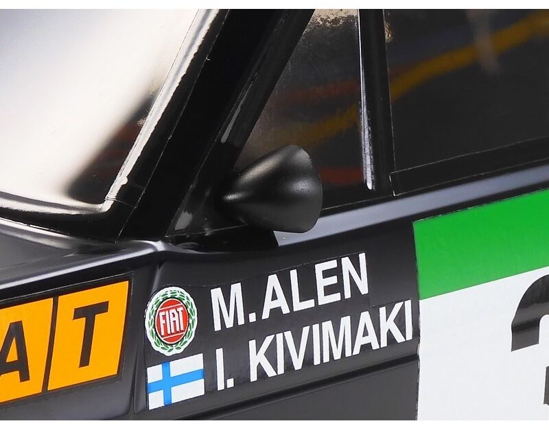 Die Form des Fiat 131 Abarth Rally Olio Fiat ist atemberaubend in strapazierfähigem, leichtem Polycarbonat wiedergegeben.