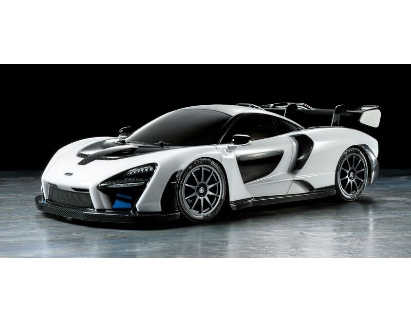 - Die komplexe, aerodynamisch ausgefeilte Form des McLaren Senna ist in Polycarbonat mit speziellen schwarzen ABS-Seitenspiegeln und Heckflügeln eingefangen.