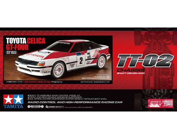 Wir freuen uns, die Veröffentlichung des Toyota Celica GT-Four (ST165) als 1/10 R/C Modellbausatz auf Basis des TT-02 Chassis ankündigen zu können. Die vierte Generation des Toyota Celica wurde im Oktober 1986 durch das High-Spec-Modell GT-Four (ST165) ergänzt. Dieses Auto mit der gleichen stromlinienförmigen Fließheck-Coupé-Form wurde von einem quer eingebauten 2-Liter-DOHC-Turbomotor mit Wasser-Luft-Ladeluftkühlung und 185 PS angetrieben und verfügte über einen Allradantrieb mit einem Mitteldiff mit mechanischer Sperrfunktion. Bei den weltweiten Rallye-Rennen von 1990 errang dieses Auto fünf Siege und feierte viele Rennerfolge auf der ganzen Welt.