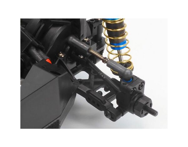 - Mit neu entwickelten Teilen wie Zahnrädern, Wannenrahmen-Chassis, Chassisabdeckung, Nachlaufblöcken mit Nachlaufwinkel von 6 Grad (XV-01 Chassis: 10 Grad Nachlaufwinkel) und Stossstangen mit Kippwinkel zur Reduzierung des Oberflächenkontaktes.