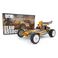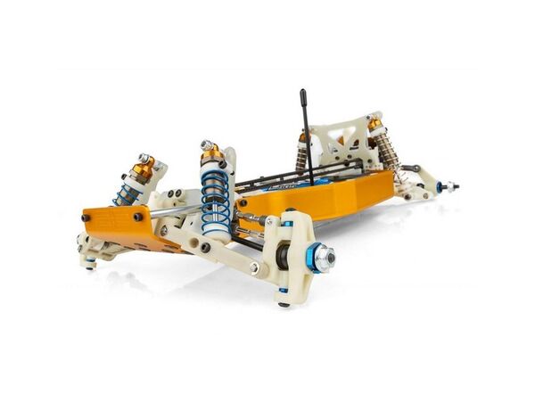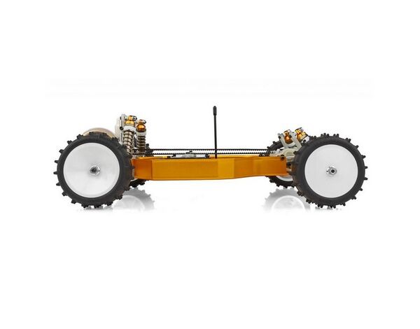 Im Kit enthalten sind eine transparente Polycarbonat-ProTech-Karosserie mit Fahrerfigur, ein 5,5 Zoll breiter Downforce-Heckflügel, ein vollständiger Kugellagersatz, CVA-Antriebswellen, Vintage 4WD-Stollenreifen sowie das klassische goldfarben eloxierte 6061-T6-Monocoque-Wannenchassis.