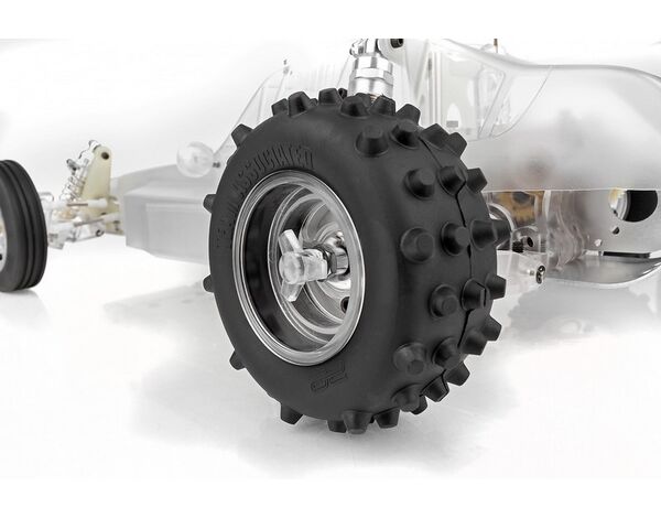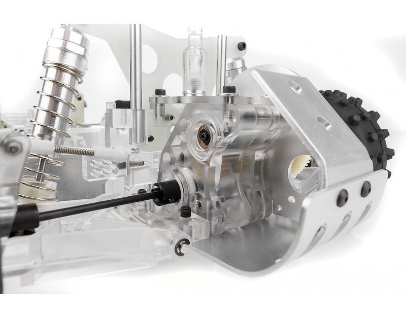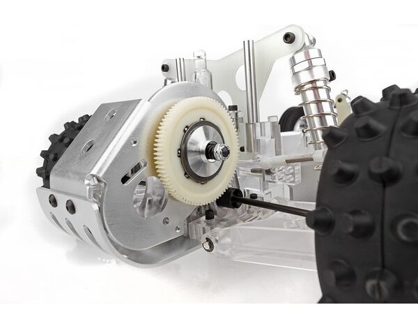 Die Voll-Renn-Hinterradaufhängung umfasst einen robusten Antriebsknochen und Radachse, sowie mehrteilige Felgen. Das Schnellspanner-Radmutter-Design ermöglicht eine schnelle und präzise Befestigung der Räder. Das Low-Profile-Getriebe verfügt über ein einstellbares VariLok-Differential und ist durch einen integrierten Motor/Kühlkörper geschützt.