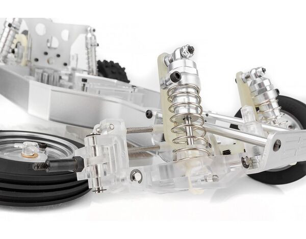 Die Einzelradaufhängung mit Spiralfederdämpfern gleicht Unebenheiten aus. Die A-Arm/Kugelgelenk-Konstruktion ermöglicht die Einstellung von Sturz, Sturzerhöhung, Nachlauf, Fahrhöhe und Federvorspannung für jede Art von Strecke.