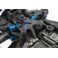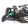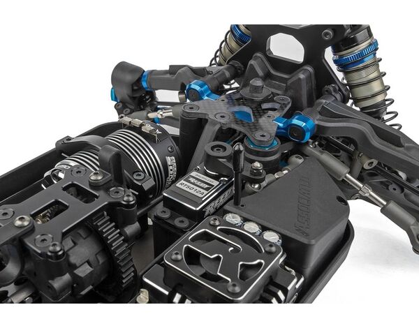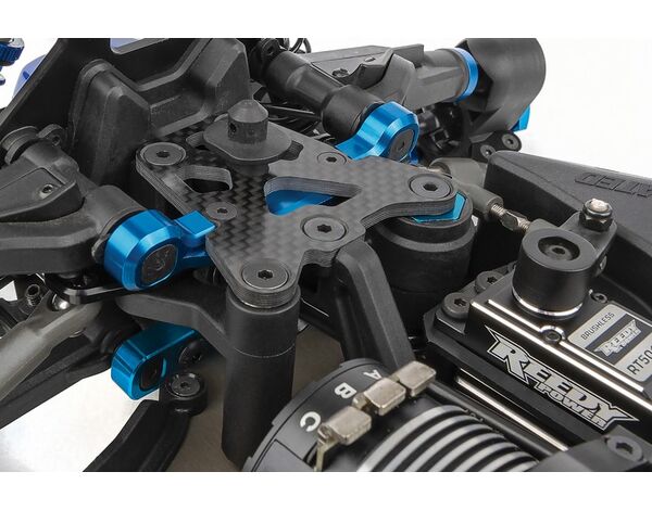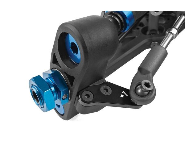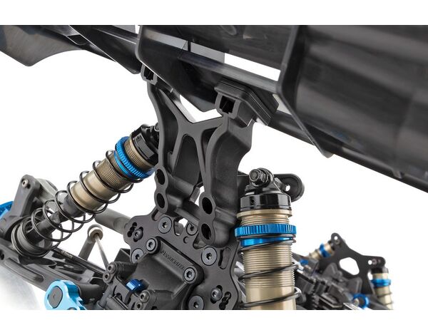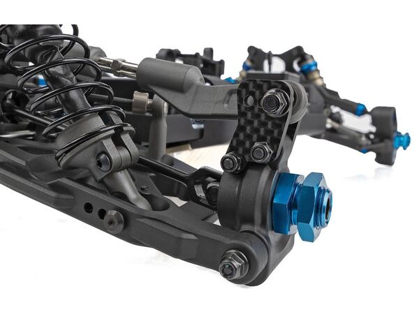 Die Aufhängung wurde mit neuen Low-CG-Dämpferbrücken vorne und hinten und kürzeren Stoßdämpfern sowie neuen hinteren Querlenkern mit drei Bohrungen für die Einstellung der Geometrie überarbeitet, die weichere Stoßdämpfer und Federn ermöglichen, ohne die Stabilität in schnellen Kurven zu beeinträchtigen.Die neuen hinteren Radträger mit breiter Basis gibt es in drei festen Achshöhen und mit 3 mm dicken Kohlefaserplatten, um verschiedene Geometrieoptionen zu ermöglichen.