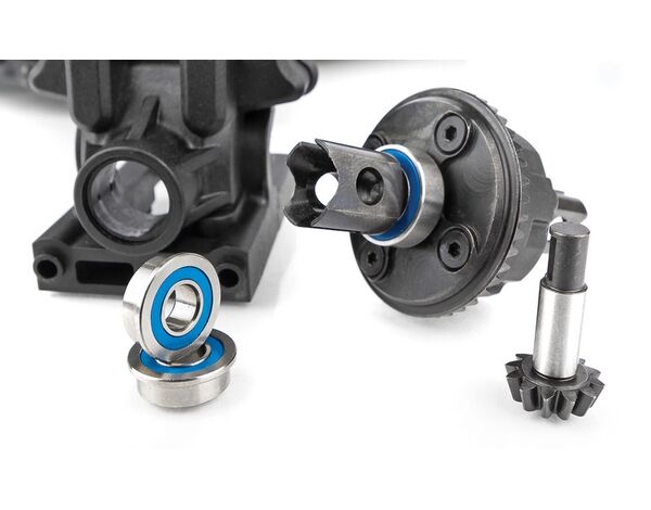 Die RC8B4-Getriebe sind mit den neuesten harten Materialien ausgestattet, die auch beim RC8T4 zum Einsatz kommen: 1) Das vordere Getriebe ist mit einem um 3,5 Grad abgewinkelten Ritzel ausgestattet, um die zentrale Antriebswelle zu begradigen und so den Wirkungsgrad des Antriebsstrangs zu erhöhen und Vibrationen und Schwingungen zu reduzieren. 2) Beide Getriebe sind mit groß dimensionierten Lagern ausgestattet: 6 x 13 x 5 mm Flanschlager sorgen für eine längere Lebensdauer der Lager, Zahnkränze und Ritzel.