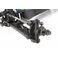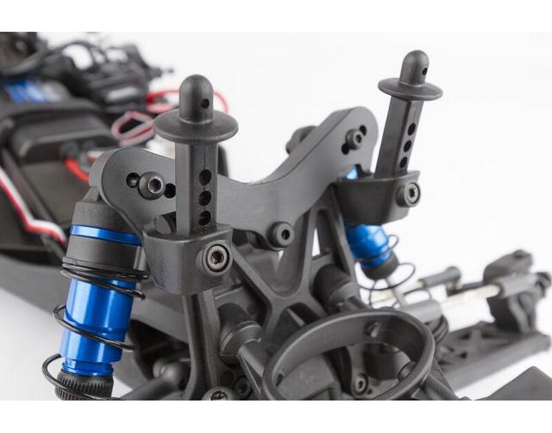 Low center-of-gravity molded composite chassis with hook-and-loop battery straps that accommodate both NiMH and 2/3s LiPo battery packs