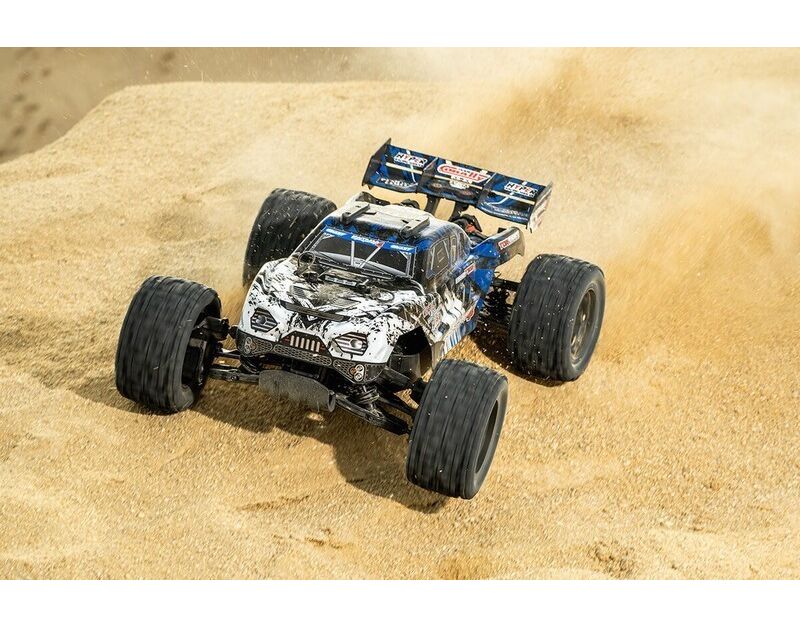 Das Herzstück des Kagama-4 ist der robuste sensorlose 4-polige Kuron 725 Brushless-Motor mit 2150 kV, gepaart mit dem elektronischen Drehzahlregler Torox 135. Dieses leistungsstarke Duo liefert eine berauschende Leistung und erreicht mit 4S LiPo-Akkus Geschwindigkeiten von über 80 km/h. Das digitale High-Speed-Servo HV7225 mit langlebigen Metallgetriebe und 25 kg Drehmoment sorgt für eine präzise und reaktionsschnelle Lenkung.