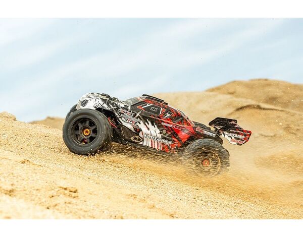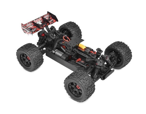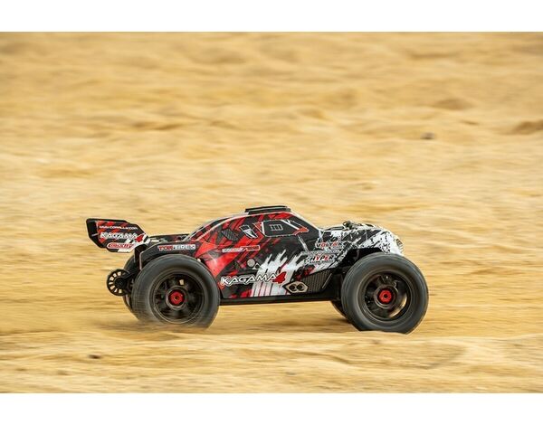 Das Herzstück des Kagama-4 ist der robuste sensorlose 4-polige Kuron 725 Brushless-Motor mit 2150 kV, gepaart mit dem elektronischen Drehzahlregler Torox 135. Dieses leistungsstarke Duo liefert eine berauschende Leistung und erreicht mit 4S LiPo-Akkus Geschwindigkeiten von über 80 km/h. Das digitale High-Speed-Servo HV7225 mit langlebigen Metallgetriebe und 25 kg Drehmoment sorgt für eine präzise und reaktionsschnelle Lenkung.