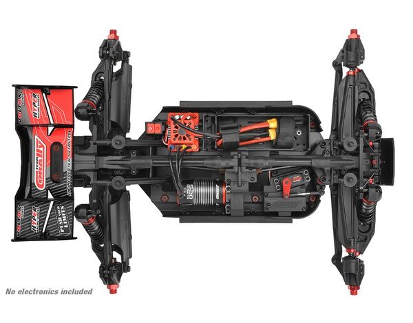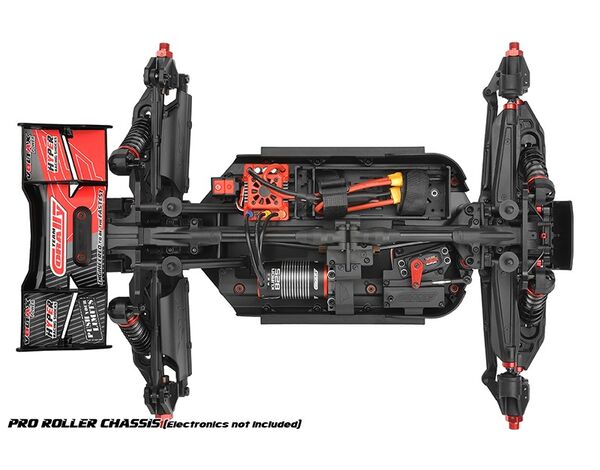 Das Herzstück dieses Antriebsstrangs sind CNC-gefertigte Kegelräder, ein rot eloxiertes Aluminium-Zentraldiffgehäuse und robuste Federstahlausgänge - eine sorgfältig komponierte Symphonie für unerbittliche Kraft und Langlebigkeit und in der Welt der Monstertrucks mit übergroßen Reifen und Rädern werden die Vorzüge dieses robusten Antriebsstrangs noch deutlicher!