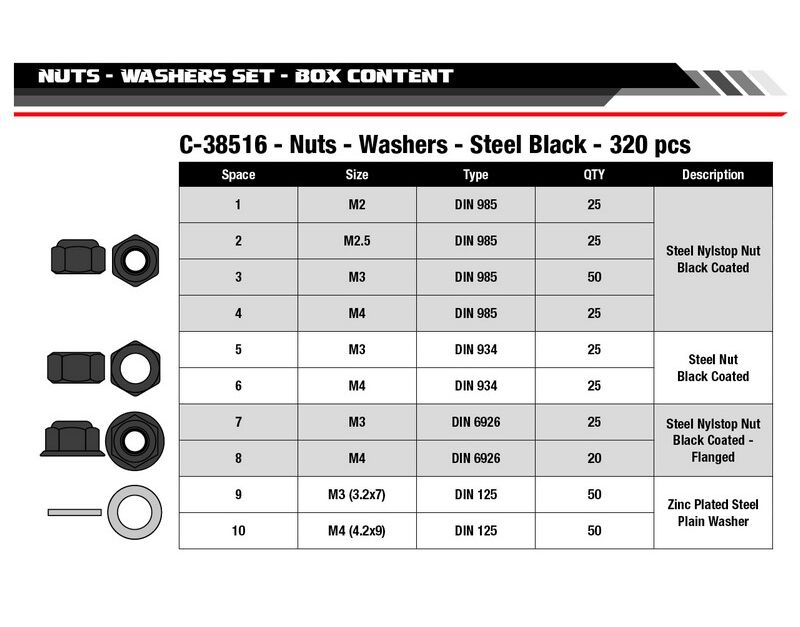 Team Corally - Nuts - Lock Nuts - Washers Set - M2 - M2.5 - M3 - M4 - Steel Black - 10 Sizes - 320 pcs