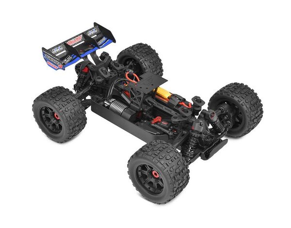 Der Aluminium-Motorhalter bietet drei Motorpositionen für eine präzise Ritzelausrichtung. Der verstärkte Antriebsstrang mit Stahl-Abtriebsschalen und einem robusten 52-Zoll-Stirnradgetriebe sorgt für lange Haltbarkeit. Die breiten Naben der Kagama- und Sketer-Räder sorgen für Stabilität und Geländetauglichkeit, während eine neue Wheelie-Bar hilft, die immense Kraft zu kontrollieren. Vom bürstenlosen Kuron 725-Motor bis zum Torox 135 ESC trägt jede Komponente zu einer berauschenden Höchstgeschwindigkeit von über 80 km/h bei. Der CT2S 2.4GHz Sender, das Chassis-Verstärkungssystem und der High-Downforce-Flügel vervollständigen das Paket und machen den Punisher4 zu einem echten Beweis für das Erbe des Team Corally’s an Innovation und Leistung.