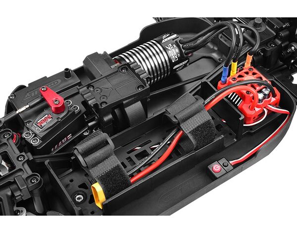 Mit einem 4-poligen Team Corally Kuron 725 2150KV-Motor, der auf einer torsionsbeständigen zweiteiligen Aluminium-Gleithalterung montiert ist, können Sie sicher sein, maximale Geschwindigkeiten für Big-Air-Stunts zu erreichen! Der Motor ist mit einem Ritzel aus Metallguss ausgestattet, das mit einem Stirnrad aus Metall am Mitteldifferential zusammenpasst.
