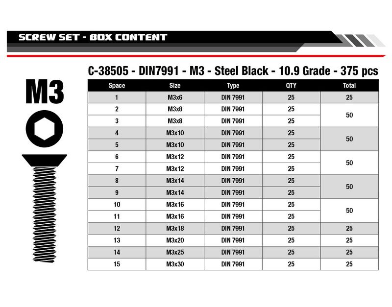 Team Corally - Screw Set M3 - Hex Flat Head - DIN 7991 - Steel Black - 10.9 Grade - 15 Sizes - 375 pcs