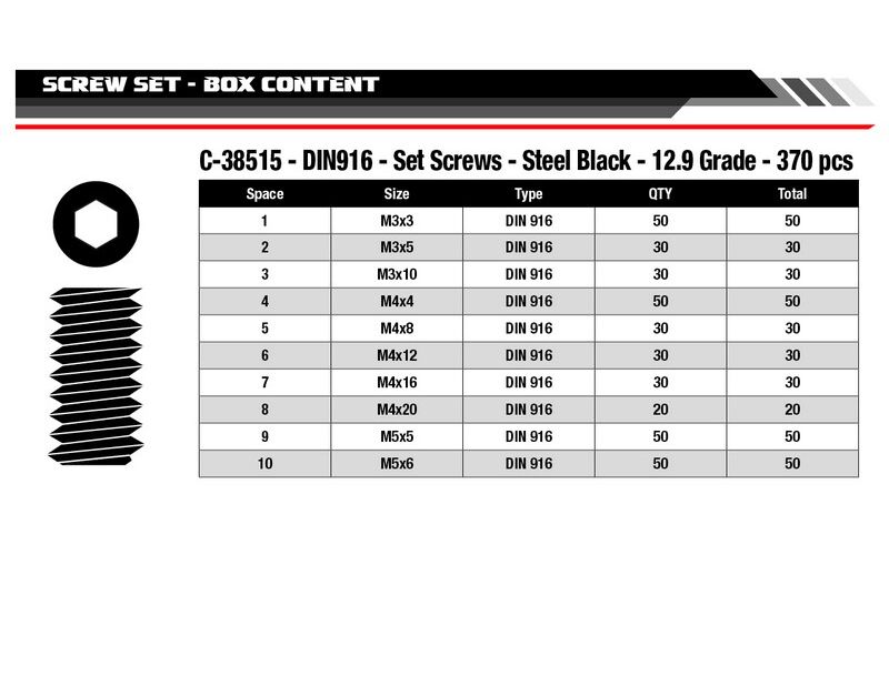 Team Corally - Screw Set - Set Screws - M3 - M4 - M5 - DIN 916 - Steel Black - 12.9 Grade - 10 Sizes - 370 pcs