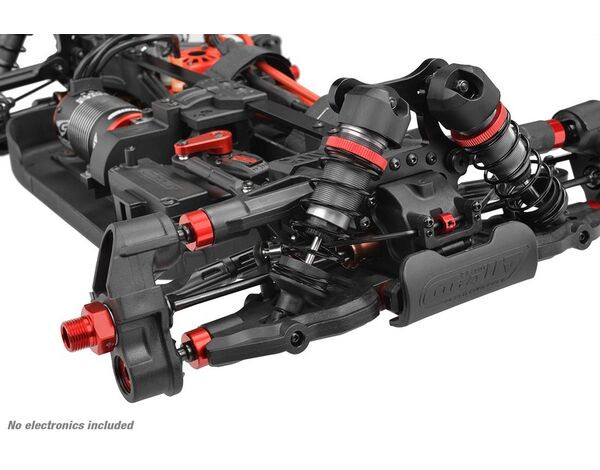 Der Antriebsstrang des Spark verfügt über ein Hauptzahnrad aus gehärtetem Stahl, ein Motorritzel und abgedichtete, mit Silikonöl gefüllte Metalldifferentiale. Das Aluminium-/Stahl-Zentraldifferential bietet zusammen mit dem schnellen und einfachen Differential-Zugang unvergleichlichen Komfort und Leistung. Mit seiner einstellbaren Motorhalterung aus Aluminium, dem 46-Zähne-Stahl-Hauptzahnrad, den gehärteten Stahl-Antriebsteilen und den vorderen CVD-Gelenken ist der Spark auf Langlebigkeit ausgelegt. Die ölgefüllten 16-mm-Aluminium-Big-Bore-Stoßdämpfer mit Gewinde, das Verriegelungssystem der Stoßdämpferfedern und die CNC-Aluminium-Stoßdämpferbrücken sorgen für außergewöhnliches Handling und Stabilität.
