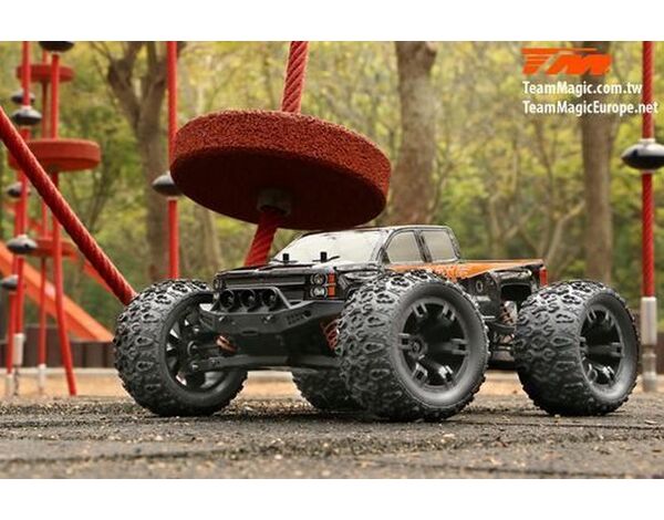 Der E5 ist der derzeit schnellste und stärkste 1:10 Monster Truck auf dem Markt. Der vordere Rammer ist mit drei weissen und zwei roten hellen LED's ausgestattet. Der Team Magic E5 beinhaltet eine schön geformte Pickup Monster Truck Karrosserie aus widerstandsfähigem Polycarbonate-Lexan um die innenliegenden Komponenten zu schützen.