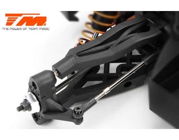 Die vorderen und hinteren Schwingen sind symmetrisch, was die Kosten für Ersatzteile senkt. Antriebswellenknochen gehen immer verloren und haben einen hohen Verschleiss - das ist der Grund wieso der Team Magic E5 vorne sowie auch hinten mit qualitativen CVD Antriebswellen ausgestattet ist (das ist bei Team Magic Modellen ein Standard). Bereits aus der Verpackung heraus hat der Team Magic E5 einstellbare Rechts-Linksgewinde sowie einen einstellbaren Servo Saver. Um grosse Sprünge und Unebenheiten besser zu absorbieren, haben wir uns für grossvolumige Öldruckstossdämpfer sowie eine lange Aufhängung entschieden. Siehe das hintere Ende - drücke es herunter!... hier gibt es einen aktive Vorspur welche beim Landen und Beschleunigen für mehr Kontrolle sorgt.